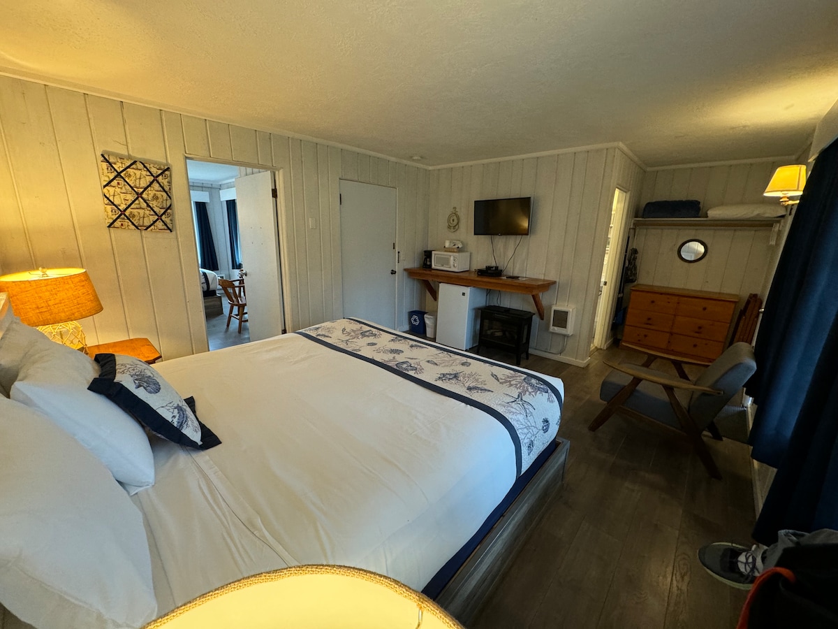 Room sleeps up to two persons, with one queen bed. Lovely ocean views looking out across a flat grassy area with a back door leading to a covered patio and path to the beach. Unit includes complimentary WIFI, a flat screen cable TV & DVD, electric fireplace, a mini-fridge, microwave, and coffee maker. Dog friendly.