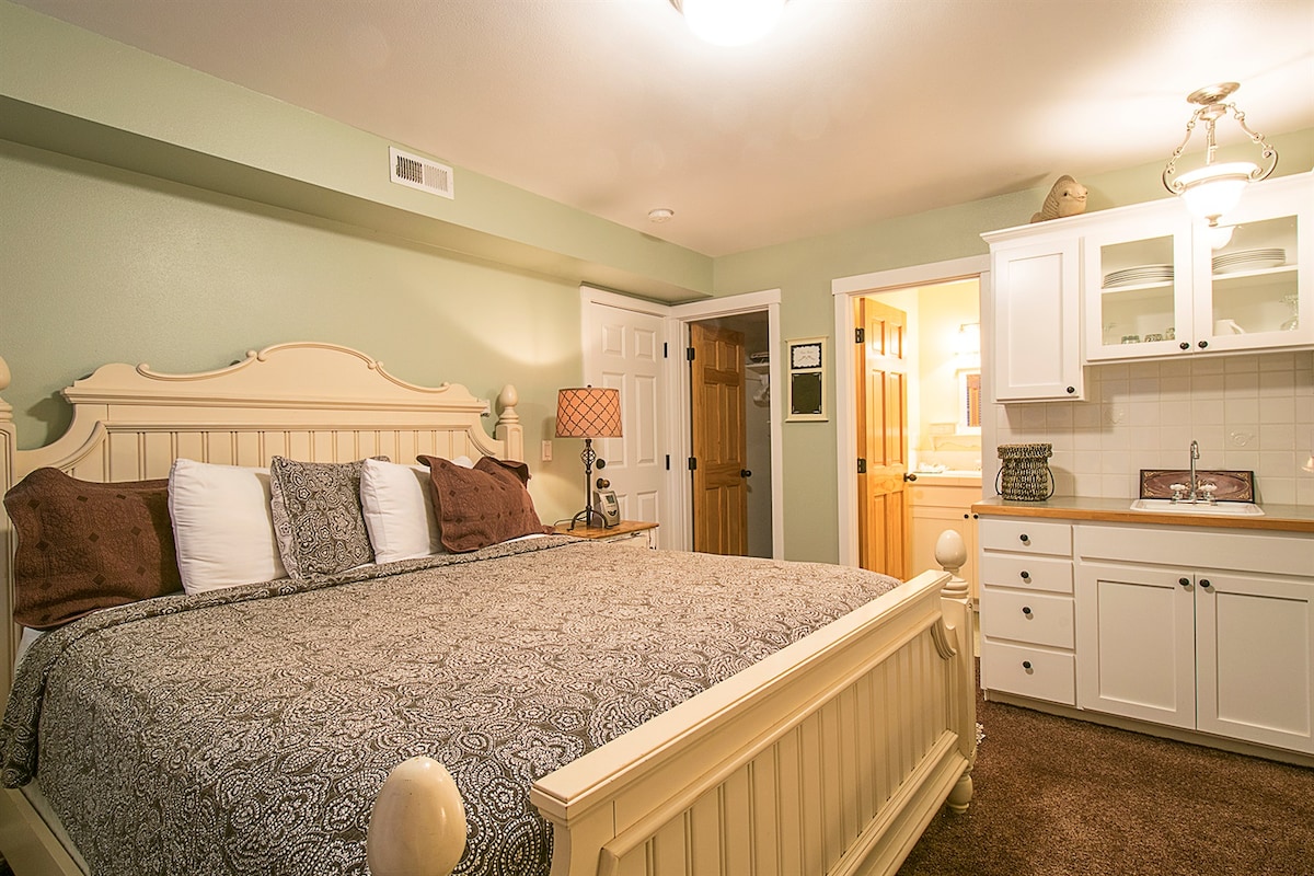 Welcome to this charming suite featuring a kitchenette, full bath, king bed, and private deck. The cozy fireplace creates a warm and inviting atmosphere, perfect for a couple’s getaway. Located below the main house (Americana), the suite can only be reserved when the main house is unoccupied to ensure your privacy. Enjoy the serene hot tub room and outdoor shower to rejuvenate your senses, or take a short stroll to a seven-mile stretch of sandy Oregon coastline. An ideal retreat for two!