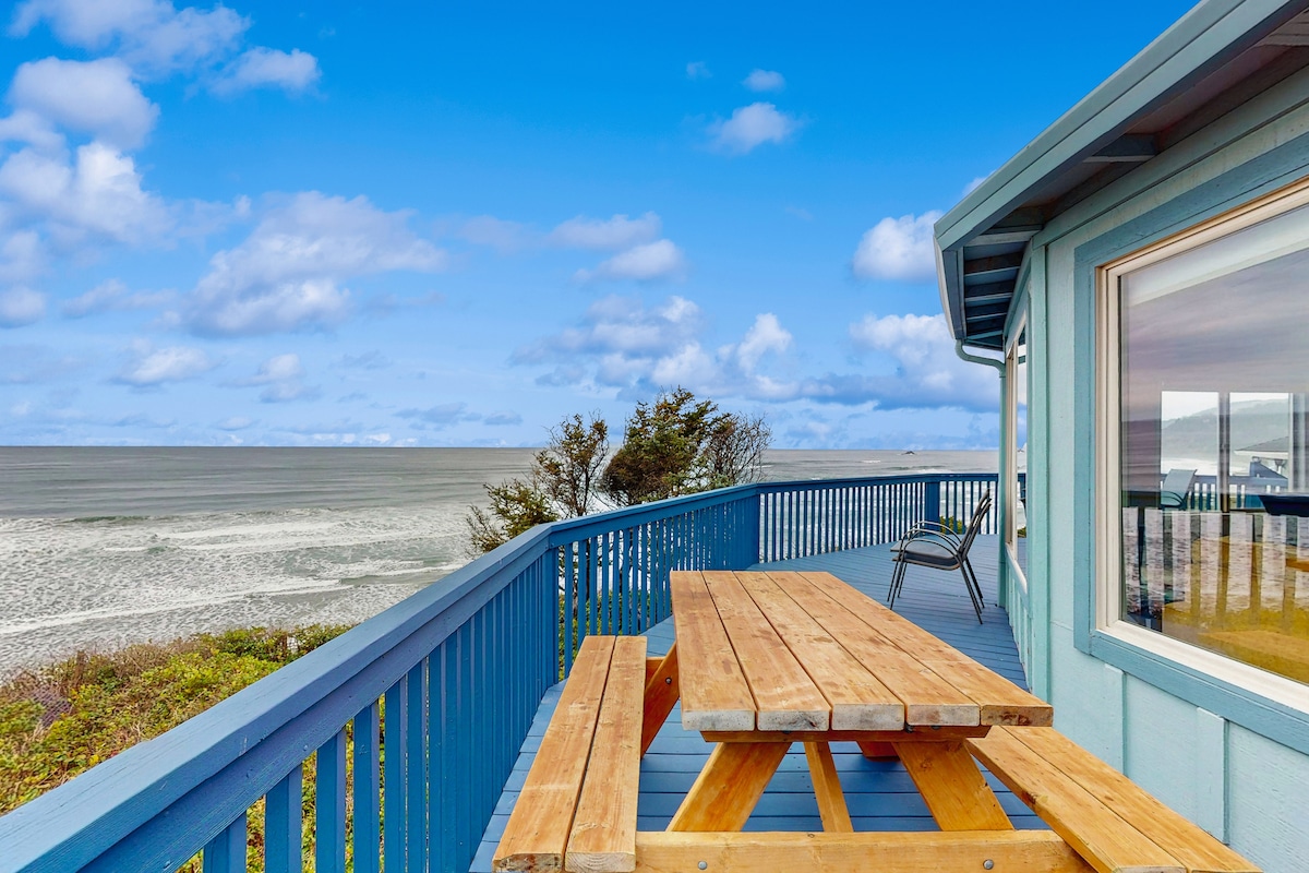 Luna Sea Watch: breath-taking ocean, white water, and sand views with room for 12 guests. Completely remodeled 4 bedroom, 3 bath home. Boasting a large deck to enjoy the sounds and sunsets of the mighty Pacific. The gorgeous remodeled kitchen is fit for a gourmet chef, complete with quartz counter tops, coffee bar and 2 large pantries with pull out shelves. Wander out to the sun room for your morning coffee. 2 minute walk to the beach. Relax to the sound of waves crashing as you fall asleep.