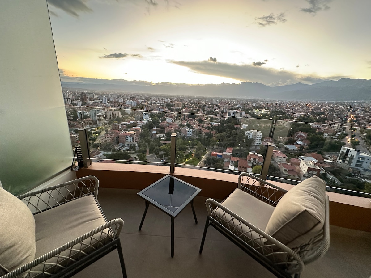 Vive la mejor experiencia en Cochabamba ⭐️ Hospédate en el piso 22 del edificio más alto de la ciudad, en una de las mejores zonas 🙌 Este departamento nuevo y moderno ofrece todo lo que necesitas para una estadía cómoda y exclusiva. ✅ Dormitorio: Cama queen, Smart TV y vestidor. ✅ Sala: Sofá cama de dos plazas. ✅ Cocina completa: Totalmente equipada. ✅ Balcón privado: Vistas panorámicas increíbles. Ubicación ideal cerca de restaurantes, tiendas y atracciones. ¡Reserva ahora!