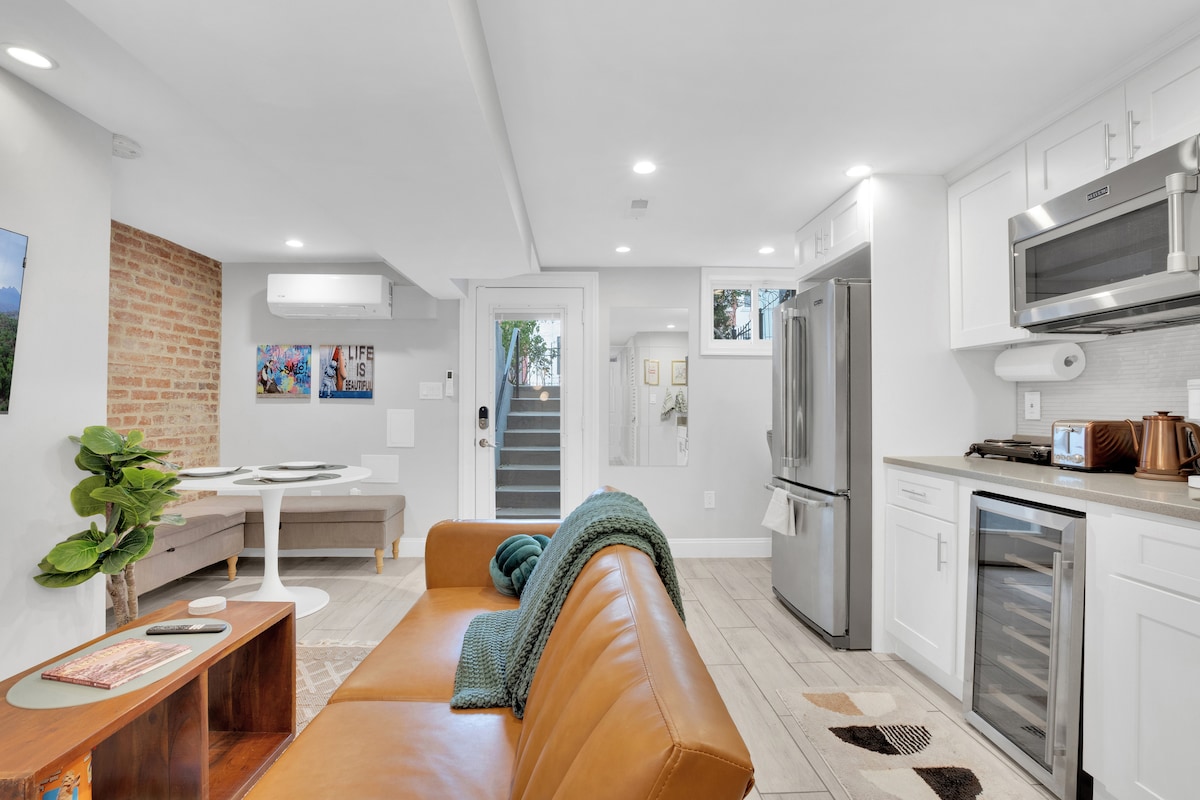 Private English basement apartment with full size windows and 8-foot ceilings • Front and rear private entrance with keyless entry • Outdoor patio (shared space) • 1 queen bed • Wireless Internet • Smart tv with Netflix • Full Kitchen with a gas range • Nespresso machine and electric tea kettle • Fresh towels and linens for 4 • Washer/Dryer • 2 guests is optimal, but a third guest could certainly sleep on the couch if desired