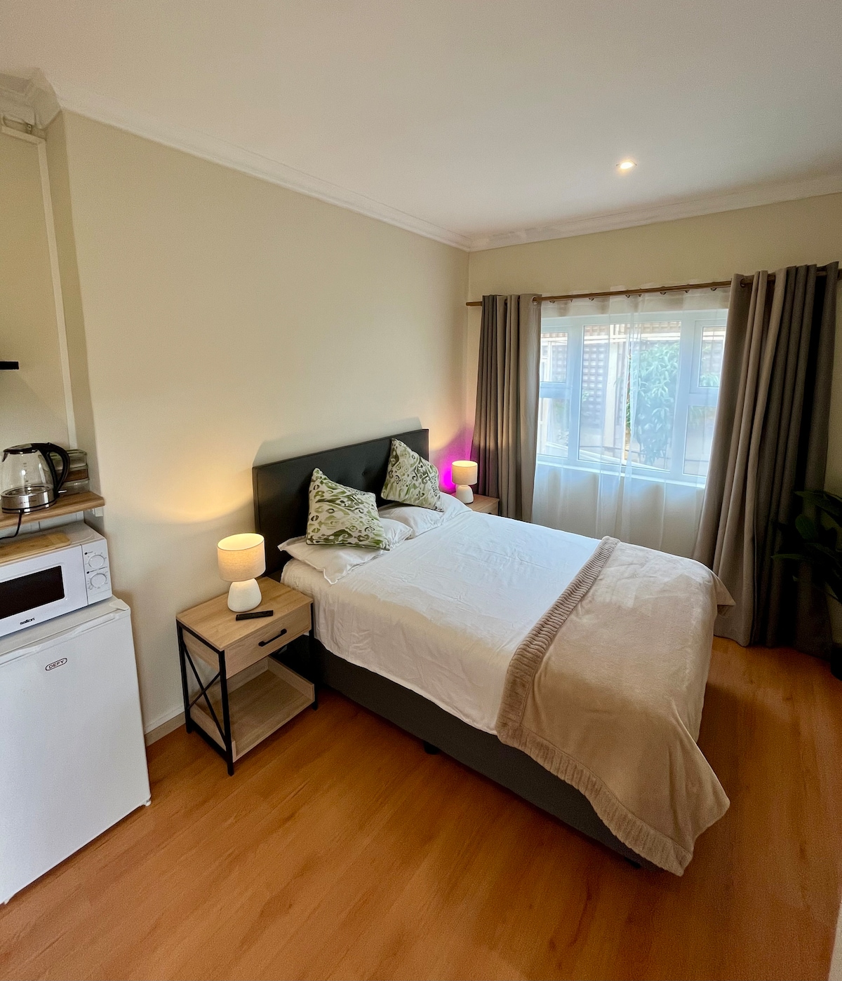 Solar powered battery inverter to escape load-shedding and forget your worries in this spacious, peaceful and centrally located place. A stone's throw from the best restaurants, shopping centres, sports facilities, and hospitals. Let the children play in the jungle gym and lush garden. Relax in the sauna and take a dip in a pool to cool down. Exercise at the gym and play pool. We look forward to welcoming you to our perfectly hidden getaway in the middle of bustling city landscapes.