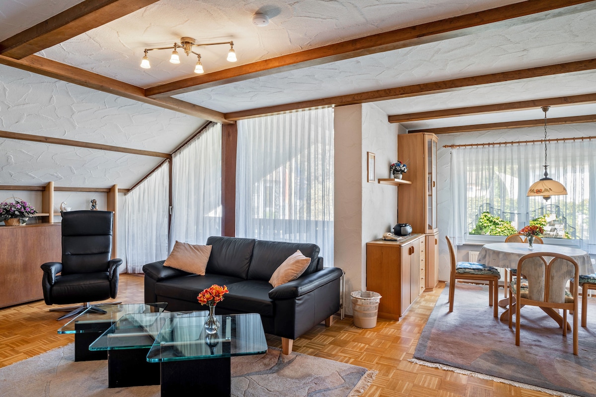 Unsere modern eingerichtete Ferienwohnung mit Balkon befindet sich im Dachgeschoß unseres Hauses mit tollem Ausblick auf den Wald, einen größeren Teich am Waldrand und einen kleinen Teich direkt vor dem Haus im Garten. Natur pur und Erholung sind garantiert - Wandern, Radfahren oder einfach Entspannen! Frankfurt, Heidelberg, Mainz und Wiesbaden sind mit dem Auto in ca. einer Stunde zu erreichen. Ein Auto ist dringend zu empfehlen - es gibt kaum Anbindung an öffentliche Verkehrsmittel.