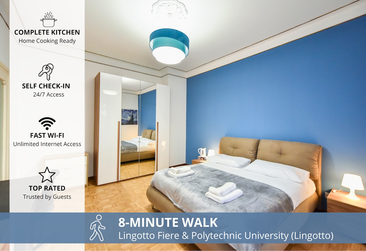 Bilocale ristrutturato, situato nei pressi degli ospedali ed al centro congressi e fiere Lingotto Gallery. L'appartamento è molto luminoso, confortevole e pulito. Dotato di WiFi veloce, stoviglie, lavatrice, asciugamani, lenzuola, asciugacapelli e ferro da stiro. Potrai andare in centro velocemente con la metropolitana. La fermata della metro Lingotto a 5 minuti a piedi e sotto casa la fermata dei bus delle linee 8/24/34/35/93/