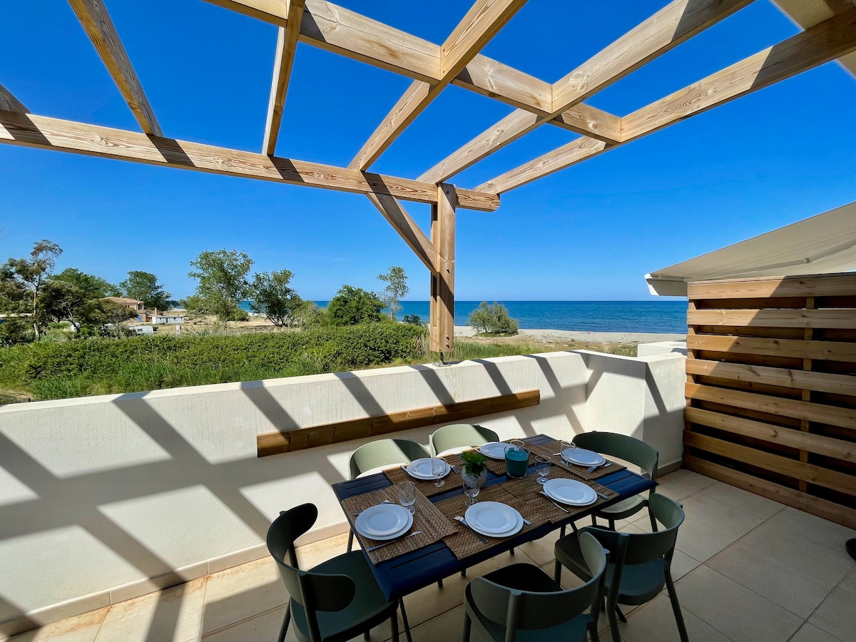 A Piaghja : "La Plage " en langue Corse est un duplex mitoyen entièrement équipé et rénové en 2023, à 150 mètres de la plage Son emplacement dans une résidence en bord de mer, avec un accès facilité à la plage est un atout de charme, il est parfaitement situé pour des vacances ou un wee-kend en famille ou amis Disposant de la climatisation, avec un parking privé gratuit en résidence sécurisée, ainsi qu'une connexion internet haut débit et des commerces de proximités à 3 minutes à pied