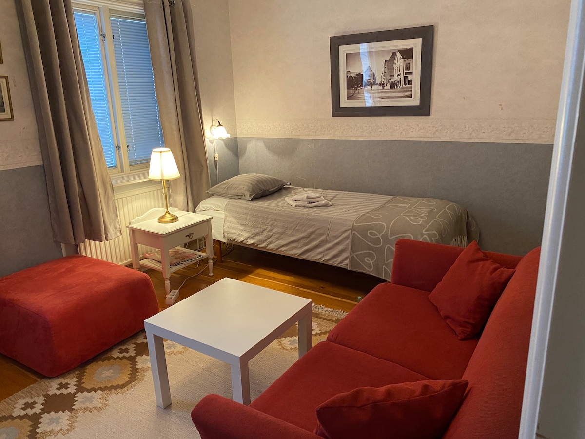 Välkommen till Humblebo! Ett charmigt gästhus med fri parkering och gångavstånd till city. Det perfekta boendet för den lilla familjen, affärsresenären eller paret iväg på weekend. Närhet till det vackra gångstråket vid ån, flera lekplatser, samtliga arenor samt city (ca 15min promenad) med affärer och restauranger. Sovalkov med king size säng (180cm) och skrivbord. Rum med vardagsrumsdel innehållande bäddsoffa 140cm samt liten köksdel. Badrum med dusch.