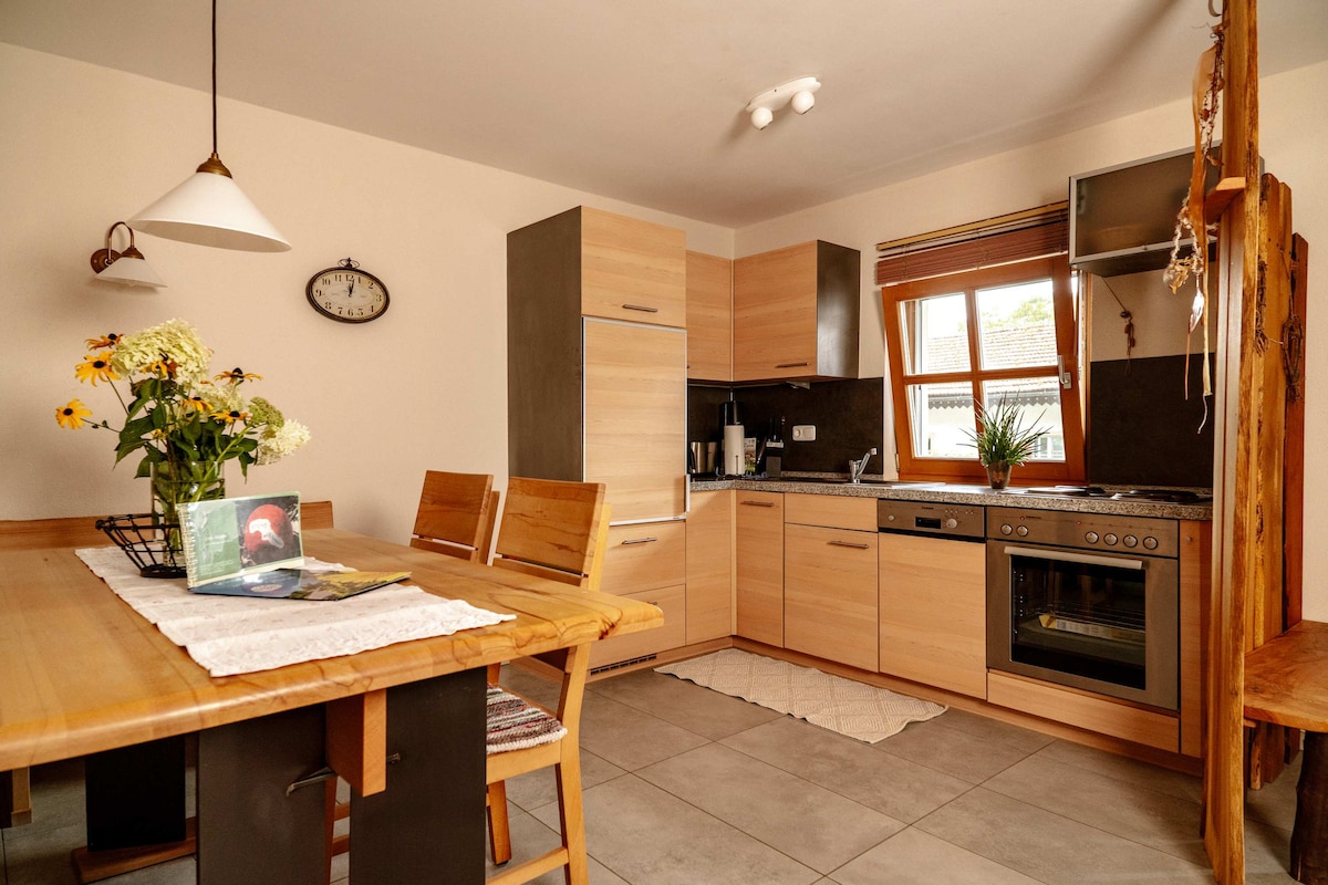 This apartment of 60 m² includes a terrace and a garden – with our favourite apple tree – for exclusive use. The small snack garden with raspberries, blackberries, snack cucumbers and cherry tomatoes (depending on the season) are yours only. This apartment on the western side of the old cider pressing house is perfect for those who want to enjoy every single ray of the sunset. Amenities in the apartment “Baumgarten”: 1 bedroom with comfortable box-spring bed, satellite TV 1 bedroom with box-spr