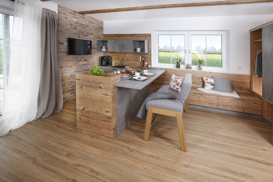 This apartment of 60 m² includes a terrace and a garden – with our favourite apple tree – for exclusive use. The small snack garden with raspberries, blackberries, snack cucumbers and cherry tomatoes (depending on the season) are yours only. This apartment on the western side of the old cider pressing house is perfect for those who want to enjoy every single ray of the sunset. Amenities in the apartment “Baumgarten”: 1 bedroom with comfortable box-spring bed, satellite TV 1 bedroom with box-spr