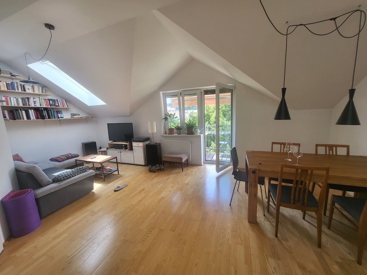 Das Haus liegt nur ca 150m von der Landstraße entfernt. Die Penthousewohnung wurde von uns liebevoll saniert und mittels zahlreicher Grünpflanzen in Ihren persönlichen Urban Jungle umgestaltet. Die Wohnung liegt im 5. Stock, der über einen Lift erreichbar ist und erstreckt sich über das gesamte Dachgeschoss (85qm) + 2 getrennt voneinander begehbarer Balkone (teils überdacht). Genießen Sie den ungetrübten Ausblick von den großzügigen Balkonen ohne angrenzende Nachbarn oder störenden Einblick.