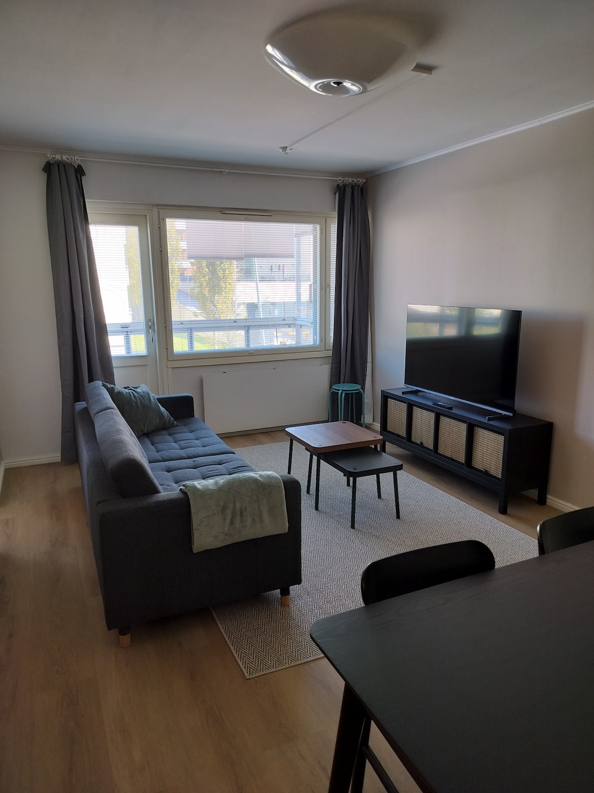 A cozy, 35,5 square meter studio apartment located in the city centre of Joensuu. The studio is in the second floor of a peaceful apartment building. There's a parking spot and an elevator. Bedlinen, towels, soap and shampoo, hair dryer, drying washing machine, kitchenware, dishwasher, refrigerator, microwave, oven and stove, coffee machine, kettle, toaster, a 43-inch smart-tv and WI-FI are included. For toddlers there's a travel crib and toys.