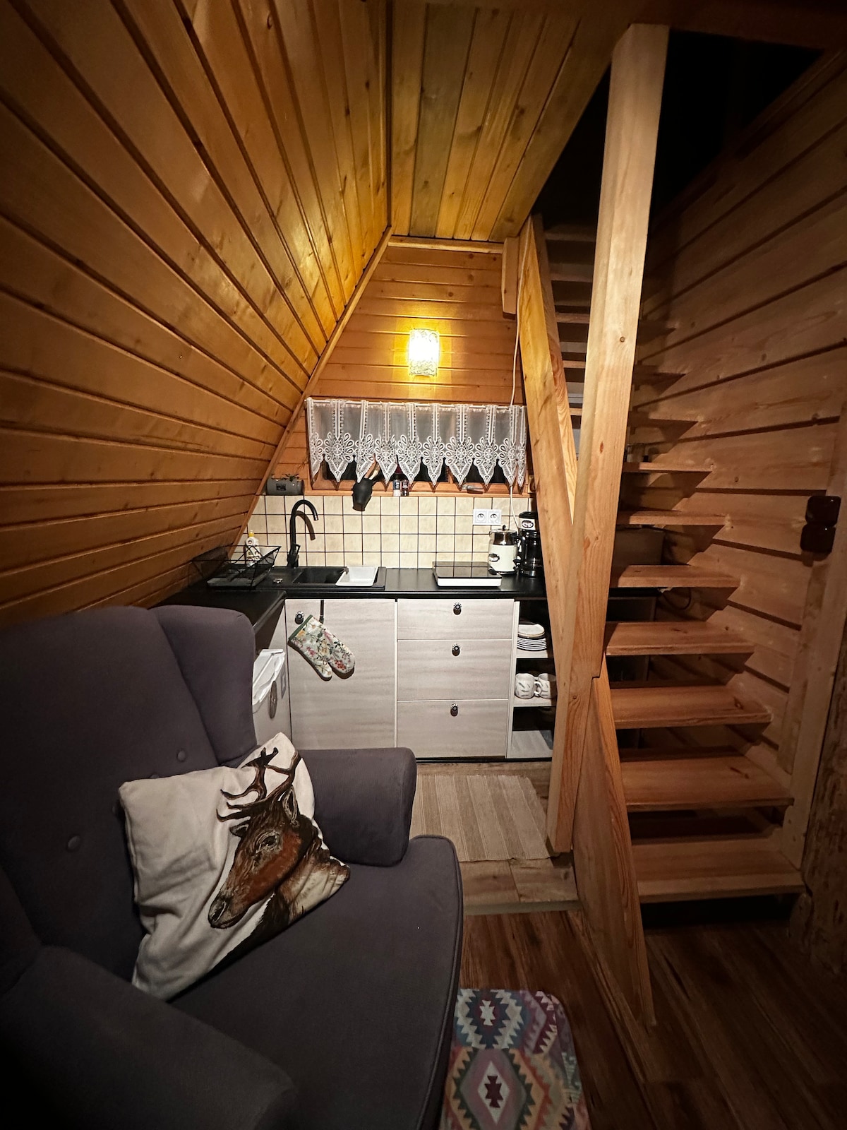 Domek przewidziany jest dla 4 osób. Posiada piętro, na którym umieszczono łóżko małżeńskie i jedno pojedyncze, na dole kanapa z funkcją spania. Domek wyposażony jest w TV oraz WiFi. *Dodatkowa opłata za drewno do kominka *Dodatkowa opłata uzgodniona z gospodarzem za organizację zaręczyn lub Walentynek * Additional charge for wood for the fireplace Additional fee agreed with the host to organize an engagement or Valentine's Day