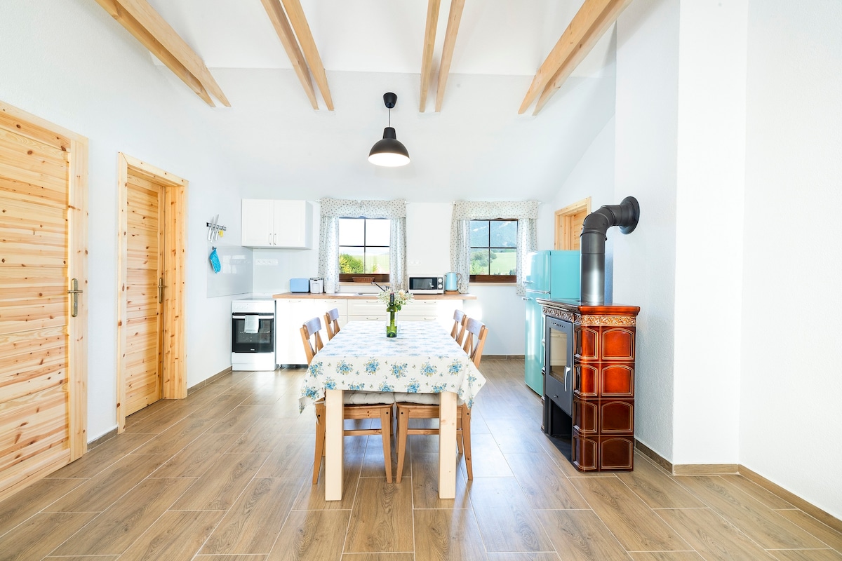 Comfortable accommodation in the beautiful surroundings of the Liptov countryside in the village of Lazisko. The house is built in 2020 in the style of a traditional Slovak wooden house and is located on a large private parcel (4,000 m2). In total there are 2 similar separated apartments in this house. The apartment has a separate entrance and will provide you with comfortable living during your vacation. Fast internet (LTE) and free parking near the house included.