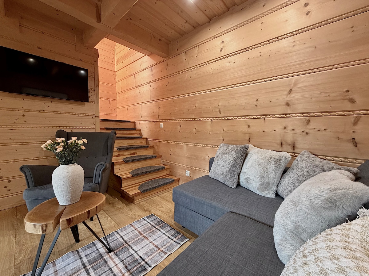 Luxury chalet with an area of 128 m2, which is also equipped with a Finnish sauna and an outdoor hot tub. It has two bedrooms, each with doublebeds and an attic gallery as a bedroom and playroom for 4 +1 children. The gallery is connected by an airy and spacious living room with a fireplace. The Chalet has 3 bathrooms, a heated ski storage room/bicycle storage, 2 terraces, a fully equipped kitchen and a shoe/ski dryer.