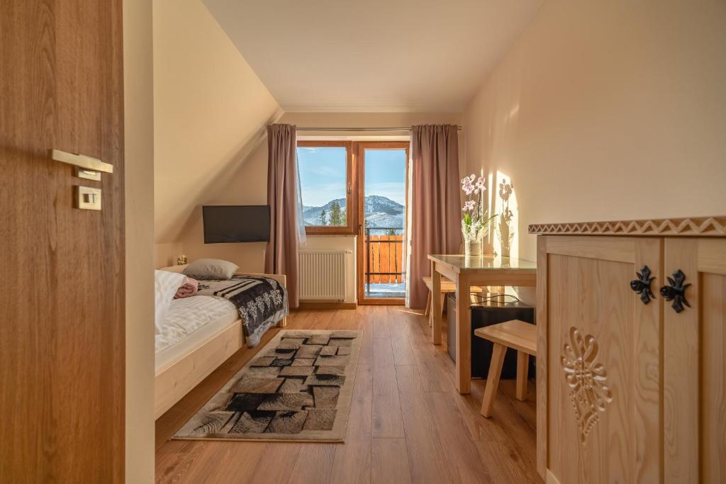 Mały kompaktowy apartament w którym znajdują się sypialnia z Smart TV,salon z rozkładaną kanapą dla jednej osoby dorosłej lub dwójki małych dzieci,stół i krzesła,duża łazienka i dobrze wyposażona kuchnia.Apartament znajduje się na pierwszym piętrze domu jednorodzinnego,drzwi wejściowe oraz klatka schodowa współdzielona z mieszkańcami domu.Piękne widoki ,spokojna okolica ,Gubałówka w odległości spaceru ,kilka sklepów spożywczych w okolicy oraz kilka góralskich karczm.Darmowy parking przed domem.