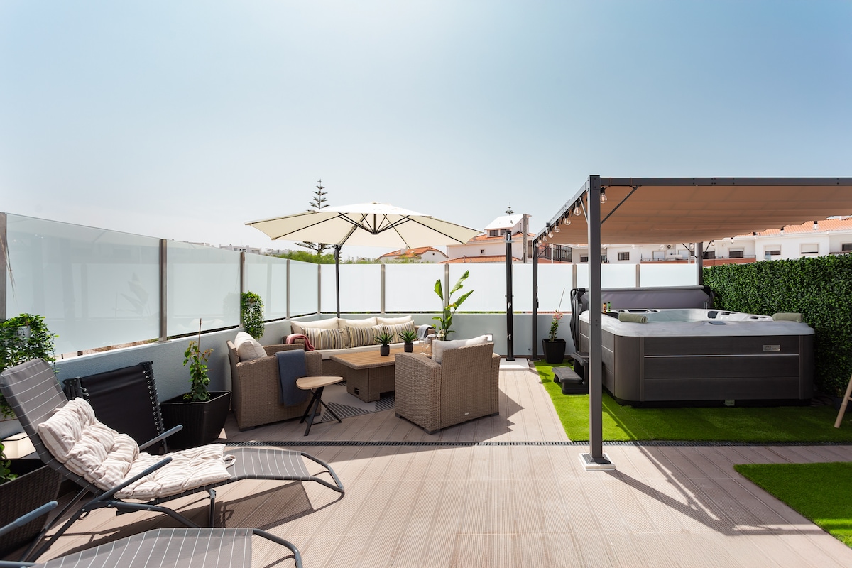 Este encantador apartamento oferece um terraço privativo com jacuzzi aquecido até 40°C com garagem, ideal para relaxar o ano todo. O espaço conta com espreguiçadeira, mesa de refeições e relva sintética, criando um ambiente aconchegante. Plantas exuberantes de 2,5m de altura envolvem o local, proporcionando privacidade e bem-estar. Com exposição solar ao longo do dia, é o cenário perfeito para desfrutar de momentos inesquecíveis ao ar livre, seja sozinho ou em boa companhia. Remodelado em 2025.