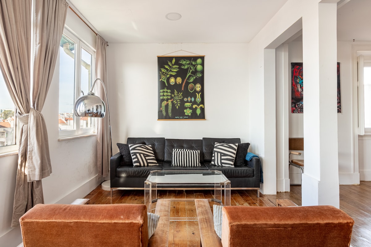 Stylish comfortable loft, 2 minutes away from Avenida da Liberdade. Casa Alegria, located right in the heart of Lisbon’s historical centre, has a very particular personality, marked by a worldly ambience visible through its colourful art covered walls and curious objects collected all over the world. From the moment you enter its door step, literally from the street, you will enjoy the spacious double height living room, with a view to the cosy ensuite in the mezzanine.
