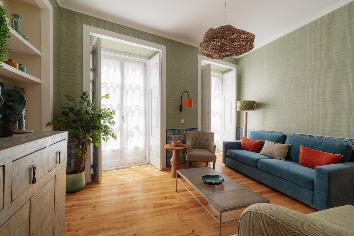 ENGLISH: This stylish and spacious home offers 2 large bedrooms, 2 bathrooms, and city views. Its atmosphere blends noble heritage with midcentury design and contemporary art. Locations don't get much better than this quiet side street of Lisbon's Chiado district. FRANCAIS: Ce vaste appartement propose un magnifique living et deux chambres doubles. La rencontre entre le style XIXème de l'immeuble, le choix de meubles vintage et les œuvres d'art contemporaines, crée une atmosphère unique.