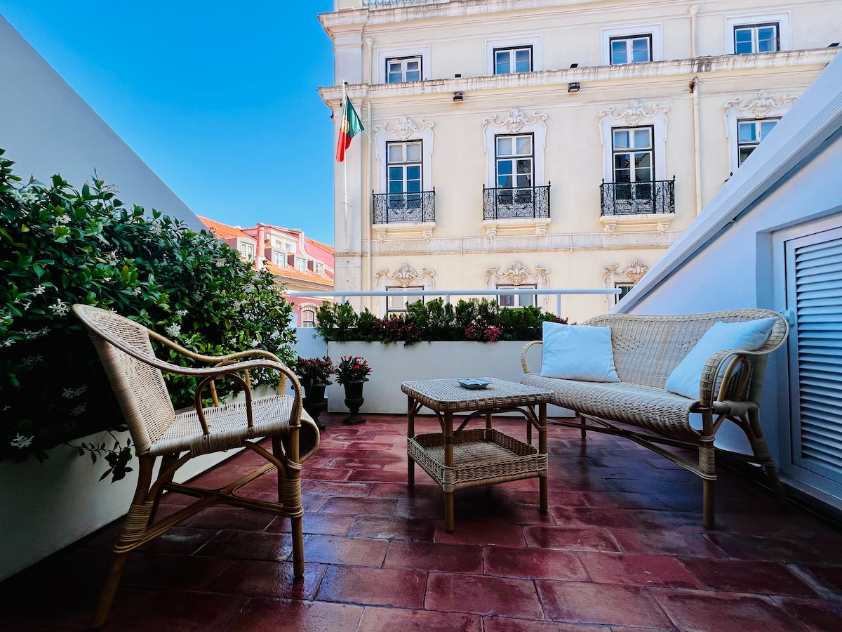Enjoy a unique experience in this luxurious penthouse located in the Chiado district. With a breathtaking view of the city and the river, it has a loft and terrace with a 180 degree unique view. The open kitchen is designed with high quality appliances and dining space which leads to the living room. For evening, 2 king size beds and 3 bathrooms with fitted wardrobes provide relaxation, comfort and welcome organization. The top floor loft has a bar area, tv and a comfortable sofa for quiet time.