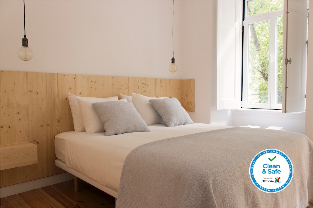 Welcome to our beautiful prestige flat, perfectly located in the heart of Lisbon city center! In a quiet oasis in one of the city's most famous historical neighbourhoods – Bairro Alto – close to Príncipe Real, Cais do Sodré and Santa Catarina - you'll feel at home in this spacious and bright studio with modern design and an exclusive garden/terrace for relaxing, eating out and enjoying the sun. Perfect for business travellers, couples & families. Fast Wifi + Workspace. Ideal for remote work.