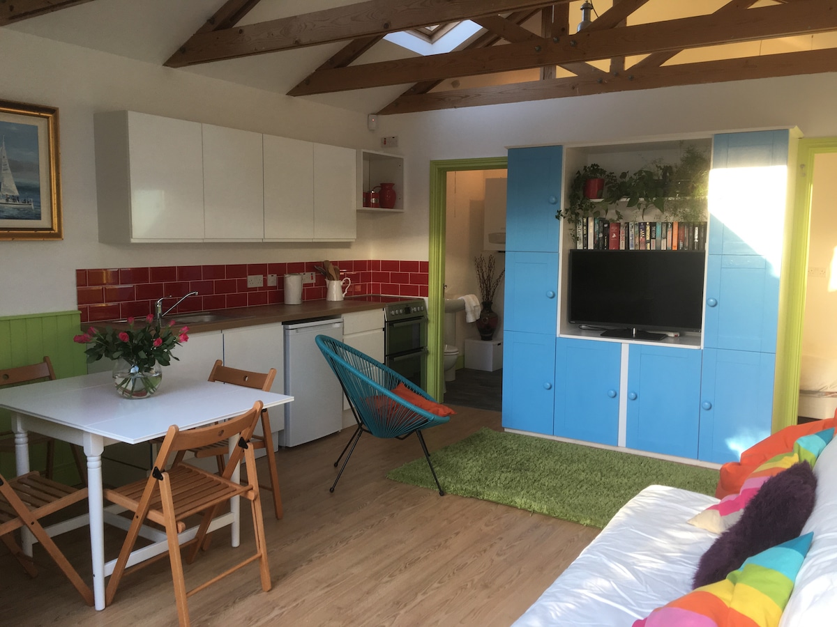 Quirky calm accommodation. Perfect for an individual but can accommodate two. Converted garage open plan studio space. Offering a sleeping area (double bed), compact kitchenette with built in appliances.Shower room,vanity & toilet. Breakfast bar/work desk.Gas heating. Wifi. TV/Netflix. Connected to my work building. Separate to our main house. Arrival times prearranged. Delays of time arrangement incurs fees. No baggage storage facilities. Easy and convenient bus routes 2 minute walk.