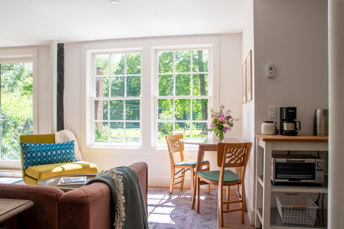 A 620 sq ft. fully private suite with your own entrance. The early American farmhouse is highlighted by a darling kitchenette, hot steam shower and original MCM furniture. We live on the other side in this year 1800 eyebrow colonial. Please note the kitchenette has an induction stove top and convection air fryer toaster oven. It's a great for light cooking. Please ask for a grill for cooking meat and greasy food. We are a zoned a b&b with bike rentals. See barn & bike, llc for more info.