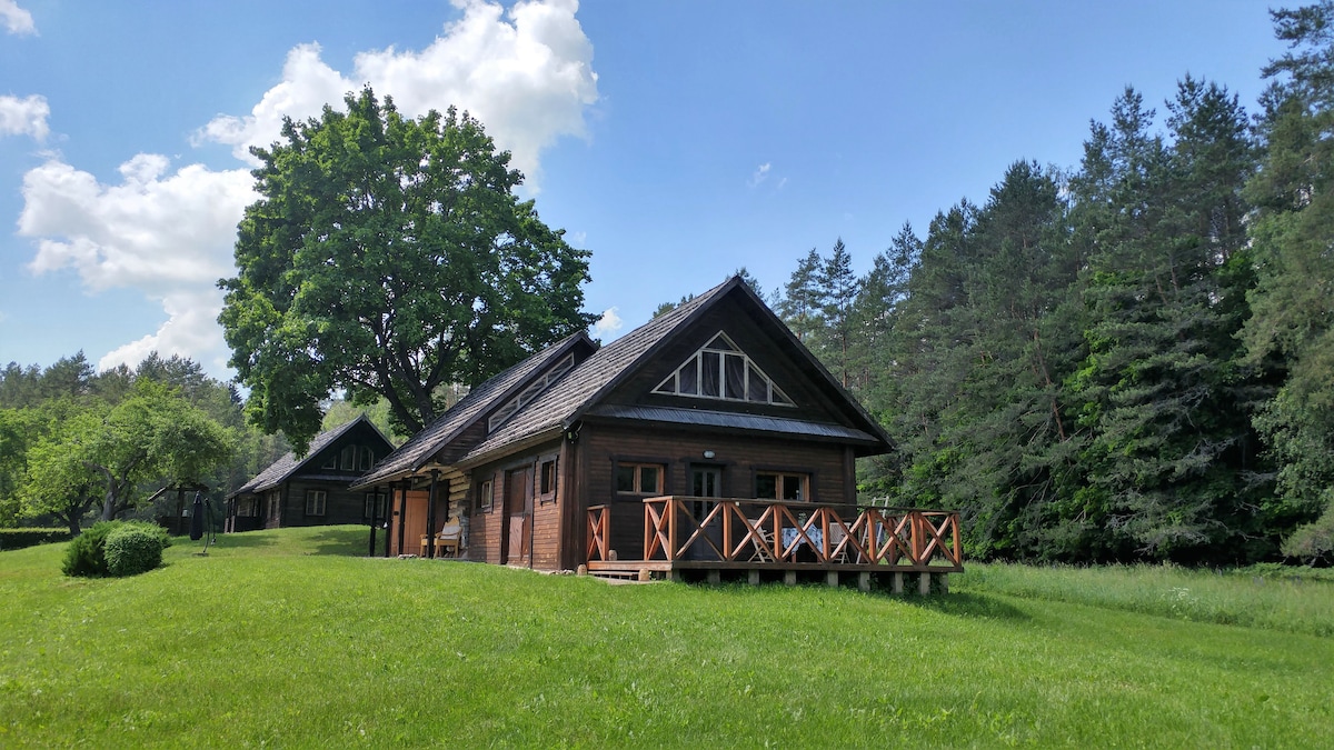 Deluxe talpina kompanijas ir šeimas iki 8 asm (4+4). Rasite: pilna virtuvės įranga sibiro kadagio siena panoraminiai langai į upės vingį 2 miegamieji nameliai. Pagrindiniame lova ir sofa-lova, papildomame 2 lovos. Papildomas automatiškai įsiskaičiuoja nuo 5 asm, kitais atvejais derinama atskirai. 🐶🐱 draugiški gyvūnams, didelė žalia zona Teritorija privati: 🌿 nesimato kaimynai 🌿 laužavietė, valgomoji zona 🌿 kubilas ant upės kranto (70€) 🌿 didelė pirtis ant upės kranto (40€), vantos (10€)