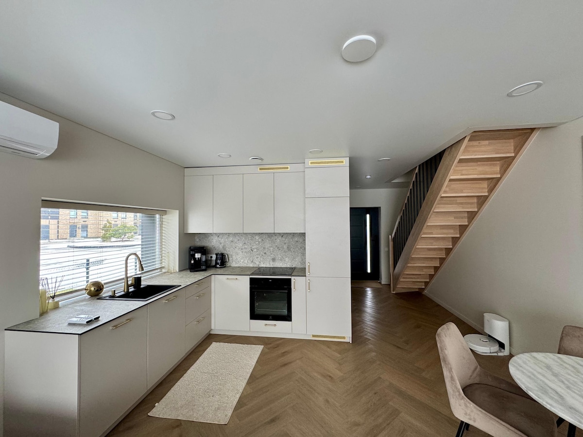 This cozy 80sqm apartment includes a big private patio and 6-star hospitality! The place has a chilling-net above the living area and is divided over two floors. It accommodates groups up to 5 persons and is located in a quiet district just 10 min. walk from Vilnius' old town. The house is fully equipped to have an unforgettable stay in Vilnius. There is a parking available. Our apartment is featured by travel vlogger Eileen Aldis in YouTube video „First time in Vilnius, Lithuania“!