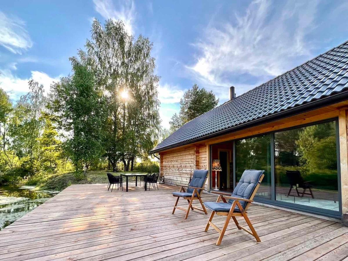 Our cabin Žvejo namelis - a great place for a group of friends, families or couples appreciating the serenity of nature, admiring the ecological lifestyle and willing to spend some time surrounded by nature. Cabin is a cozy warm traditional Lithuanian countryside log house (studio with attic) with small kitchen, bathroom/shower, a fireplace and sofa bed. One double and two single mattresses are in the attic of the house. The house has a spacious terrace linked with the footbridge to the lake.