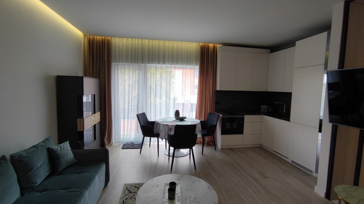 New Modern apartment „J&R“ in a new building. The apartment has a separate entrance, spacious balcony, floor heating and air conditioning. Private free parking- in front of the entrance. SELF CHECK-IN at any time 24/7! Quiet area, close to the city center- 6 min by car, 15 min by public transport. The bus stop is 250m from the apartment. Area is filled with shops and restaurants nearby. Cozy apartments have everything you need for a comfortable stay !