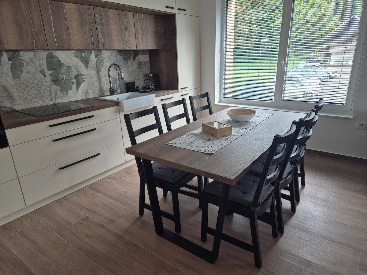This stylish apartment in a small town is perfect for families or groups of friends. Its central location makes it easy to explore Slovenia’s top attractions. The apartment includes two cozy bedrooms, a bathroom, and a spacious living area with a fully equipped kitchen, making it ideal for both short stays and longer getaways. Extras like guided tours, car and van rentals, and airport shuttle from Ljubljana Airport are also available to make your stay even better. We’d love to welcome you!