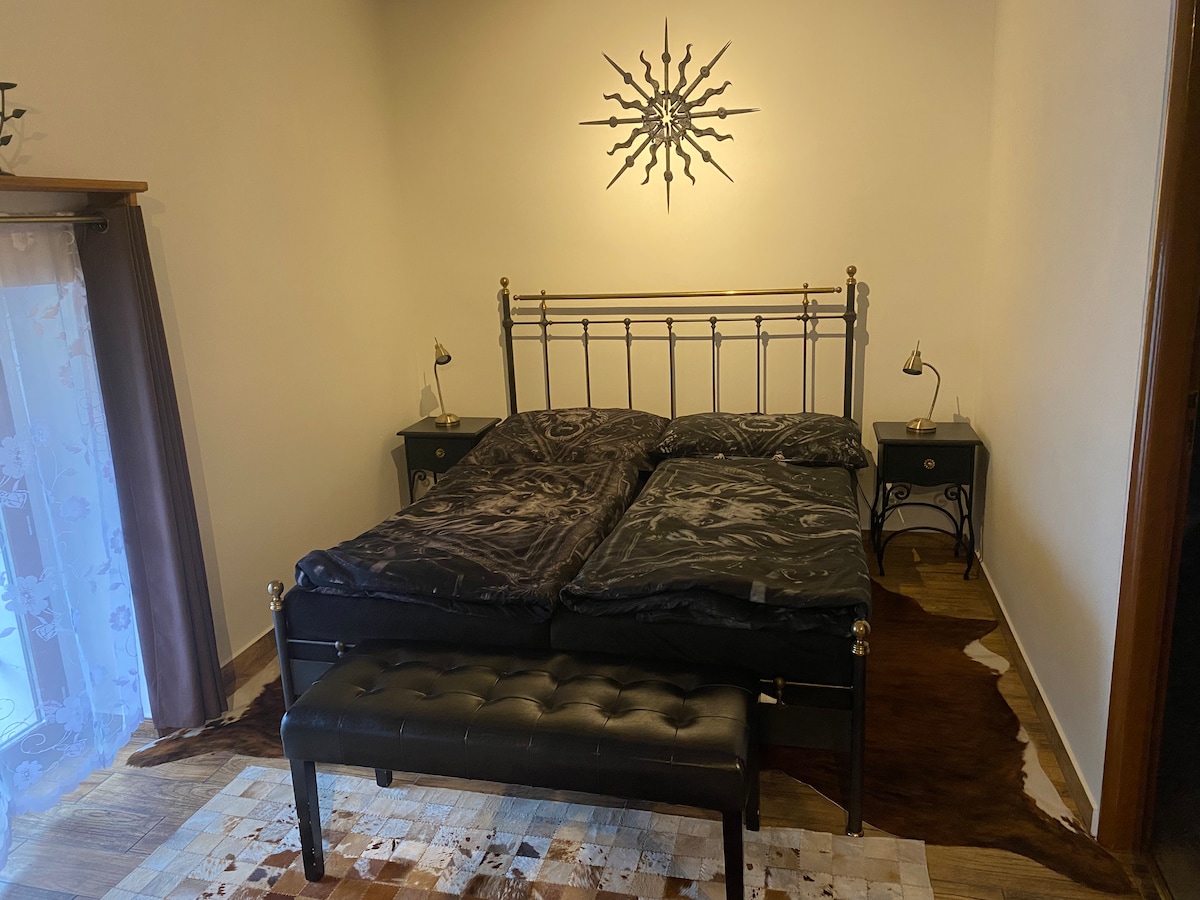 Do apartmánu se dostanete přes dřevěné schody s mini balkónem. V apartmánu jsou 2 místnosti: koupelna a místnost kde se nachází manželská a jednolůžková postel, kuchyňský kout a pohovka s televizí. Apartmán je jedinečný díky své vybavenosti a kovovým nábytkem.