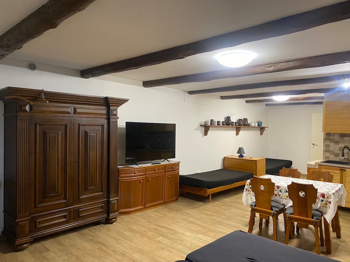 V tomto pokoji je manželská postel a rozkládací pohovka s možností přistýlky pro další dvě osoby, lednice, rychlovarná konvice, kuchyňský stůl, psací stůl, klimatizace, sociální zařízení se sprchou.