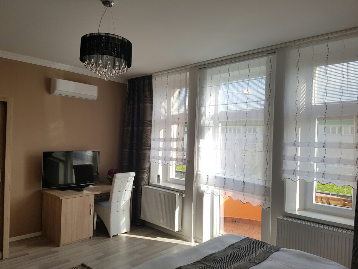 V tomto pokoji je manželská postel a rozkládací pohovka s možností přistýlky pro další dvě osoby, lednice, psací stůl, klimatizace, sociální zařízení se sprchou, balkon.