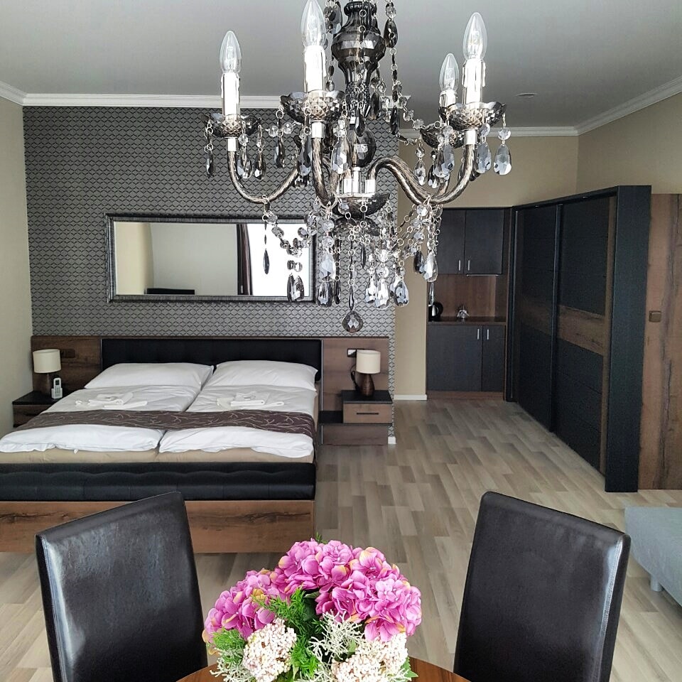 Apartmán se skládá ze dvou místností: V jednom pokoji je manželská postel, v dalším pokoji je kuchyňská linka s jídelním stolem. Dále se tam nachází rozkládací pohovka (1,5 lůžka). Vybavení: kuchyň, vařič, rychlovarná konvice, lednice, trezor, sociální zařízení se sprchou