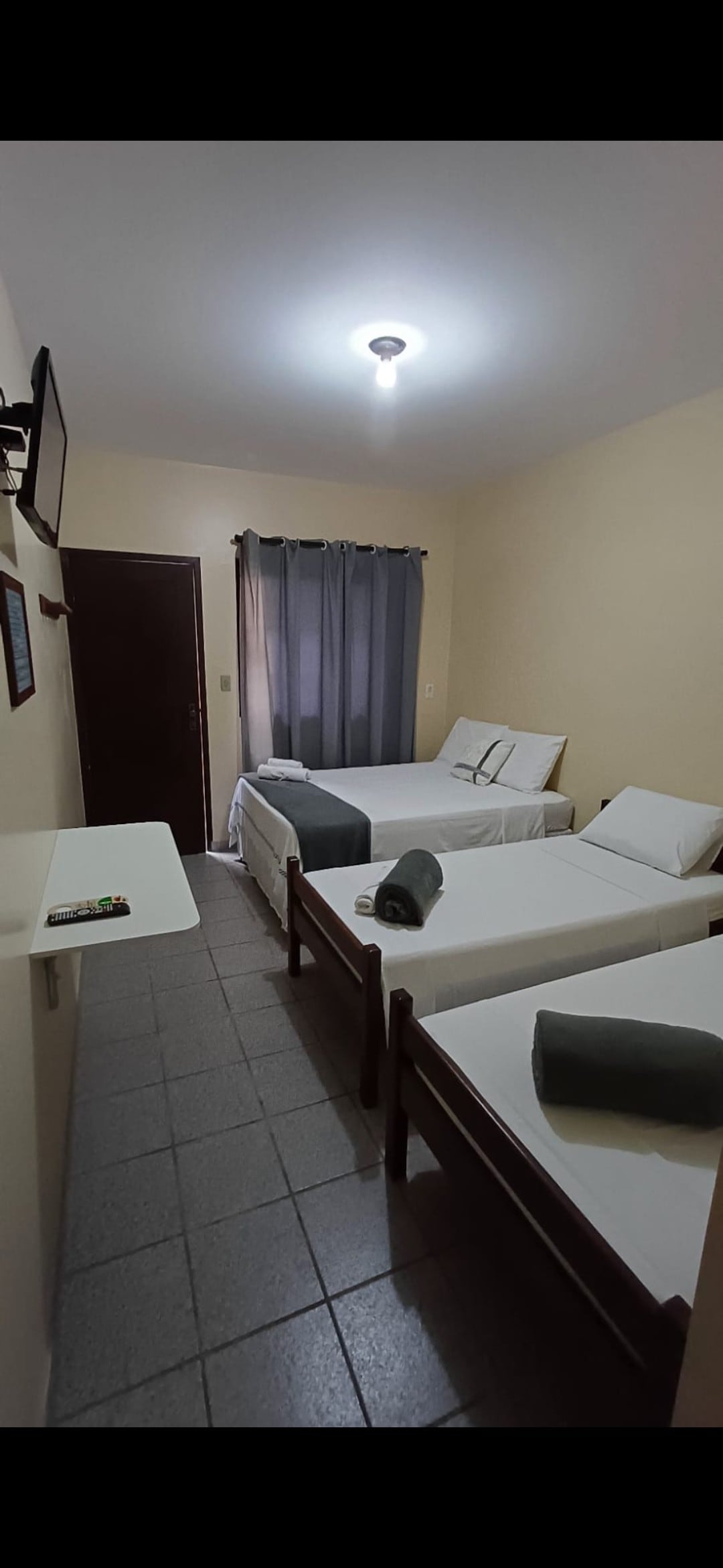As suítes possuem 1 cama casal e 1 cama solteiro, podendo adicionar mais uma cama de solteiro. Suites completas com entrada individual, ar condicionado e frigobar.