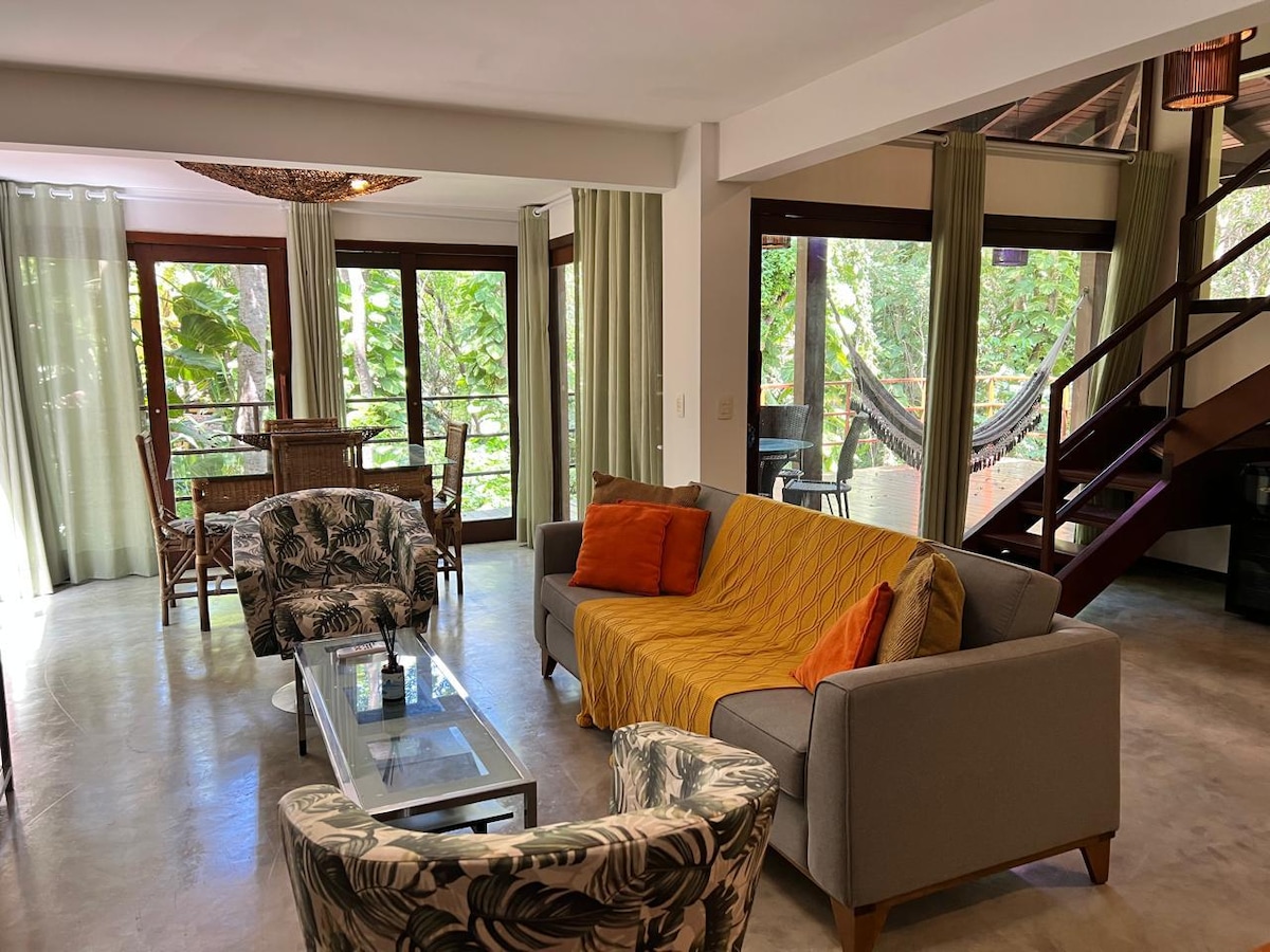 Casa confortável e com Estilo rústico e inserida em Uma Vegetação nativa que nós surpreendemos com visitas inusitadas de pássaros e micos ... Com Uma localização privilegiada a 800 metros da rua Principal ou seja da praia do centro . Com Guarita 24 horas dando Segurança e conforto para uma Estadia inesquecível!