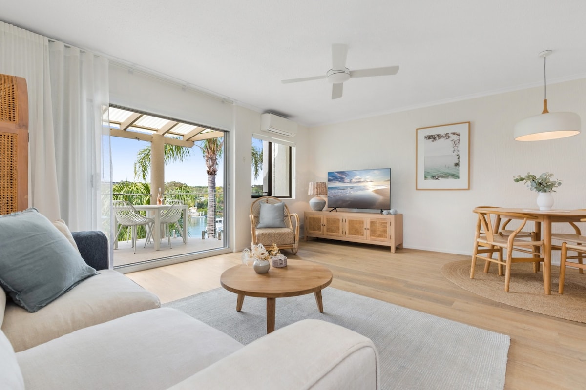 Fresh, bright upstairs Apartment, overlooking the 3 largest lagoon pools in Noosa. Located on Noosa's beautiful river. A great location, directly opposite the Noosa Marina/Ferry, short drive to Hastings Street/Noosa Main Beach/Noosa Heads (10 min). Bus stop at the front of the resort. Unwind and relax on your deck or in the Resort tropical gardens and pools space, after a day exploring. Complementary champagne breakfast. Perfect for 1 couple or small families. Not ideal for 4 adults.