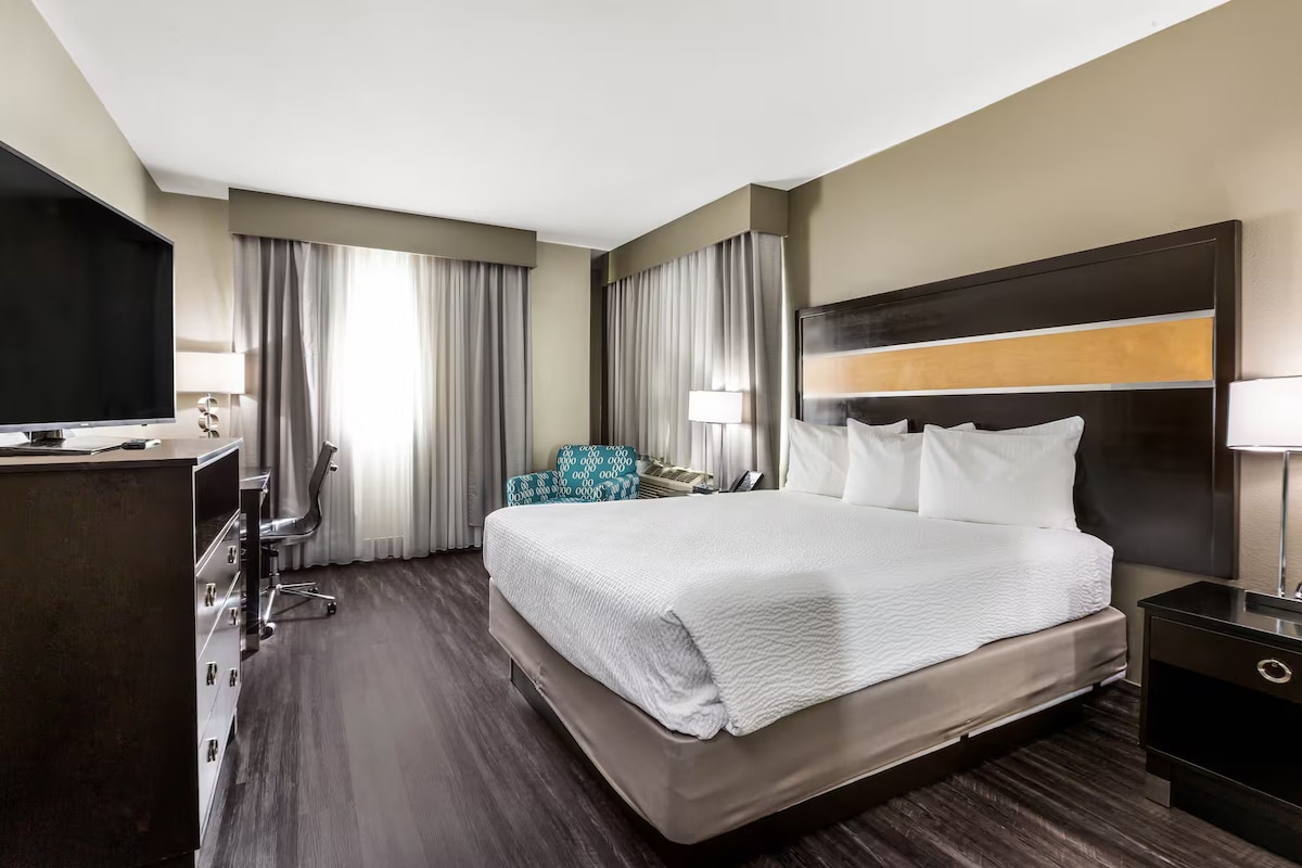 Enjoy the expansive comfort of a king-size bed in the Z King room, perfect for sharing or stretching out solo. Stream your favorite shows on the 43" HDTV with high-speed WiFi, and unwind in European-style double duvets, oversized towels, and micro-fiber bathrobes. Indulge in Tommy Bahama bath products and start your day with unlimited Keurig coffee and bottled water. This room blends playful luxury and relaxing amenities for a truly memorable stay.