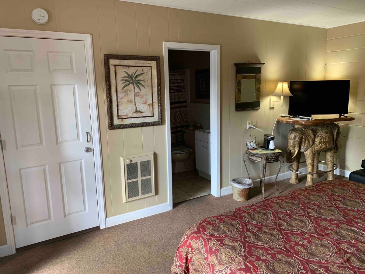 This riverfront cabin is an intimate little hideaway with authentic character. Our one room cabin has River access and Riverview, sleeping space for four people on a queen size bed and queen size futon. A full kitchen with quality cooking utensils, full size refrigerator, electric range with oven and fully stocked coffee bar. The covered dock is available for fishing and if you bring a boat you may use the dock to shelter it. THE CABIN IS NOT PET FRIENDLY!