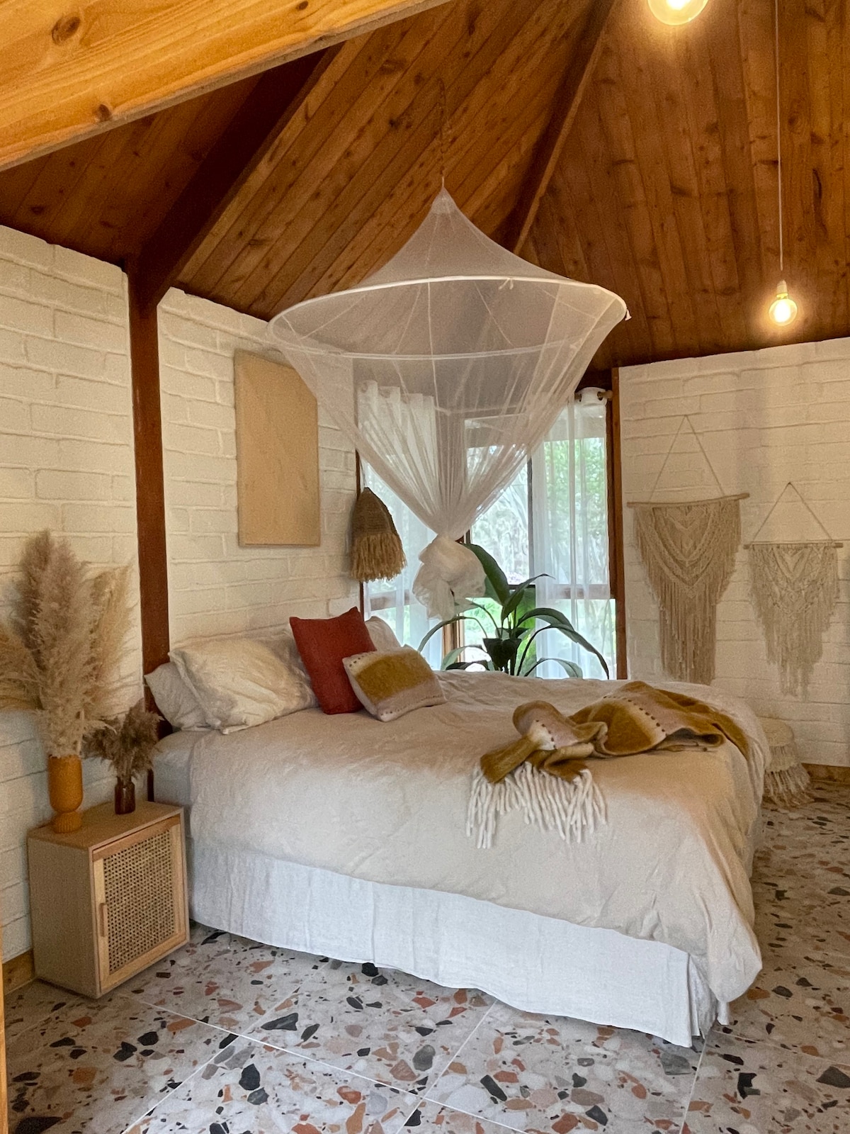 The cabin sits quietly among the vines on our working vineyard at Blame Mabel. Step outside and wander among the rows, a place to breathe, slow down, and enjoy the stillness of the country and sky. The sunlit kitchen waits for cooking at your own pace, the fire flickers in cooler months, and the bedroom wakes gently with the morning light. There’s no television. Nights are still. It’s the kind of stay you book when you need to disappear for a while. Mabel may wander by to say hello.