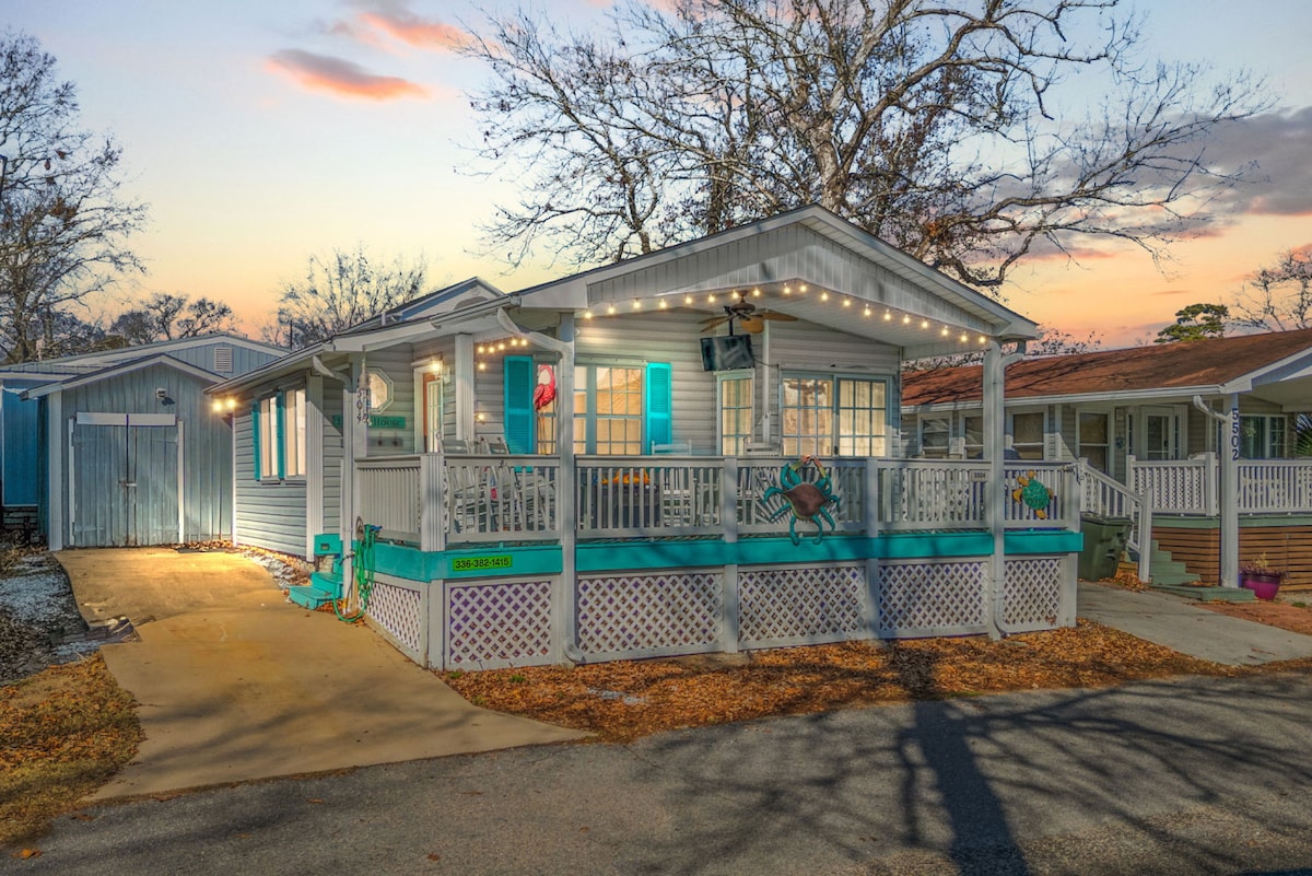 Take it easy at this unique tranquil cottage 4 minutes from Holden Beach. The Tin Roof Cottage is quite cozy as you will enjoy your rainy afternoon naps under a tin roof or enjoy local shopping. This home features a queen bed, a full bed, and a porch swing with outdoor ceiling fans. The kitchen is fully equipped with pots/pans, utensils, and a few selected spices for cooking.