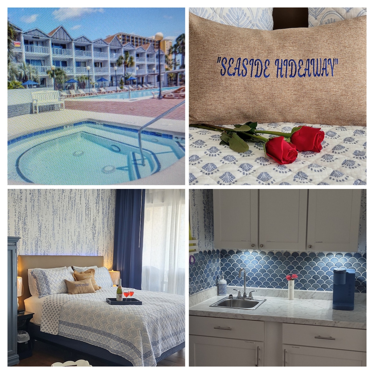 Direct oceanfront efficiency with balcony, outdoor year round temp.reg. pool with oceanfront deck, whirlpool, wall fireplace, two queen beds, large 55" LG HD flatscreen with soundbar, stocked kitchenette (no stove) and bath, wi-fi, cable TV. restaurant & bar, fitness room. Free covered parking, mini-fridge, microwave, toaster, coffeemaker,the space is approx.400 square feet, add a good wine or champagne and vase of flowers for a one time charge of $50.