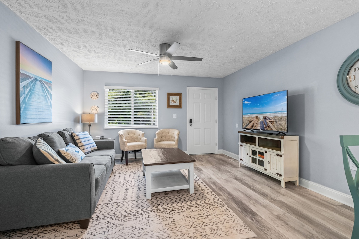 This centrally-located, dog-friendly, single-level home will have you creating perfect days in no time! Newly remodeled in 2022. Less than 2 miles to the beach, minutes away from restaurants, and several golf courses within reach! Inside you will find hardwood floors, an open living/kitchen area with plenty of room to gather, and a charming adjacent room that includes a table that seats six. TVs in every room with streaming, and Serta mattresses to ensure a blissful nights sleep!