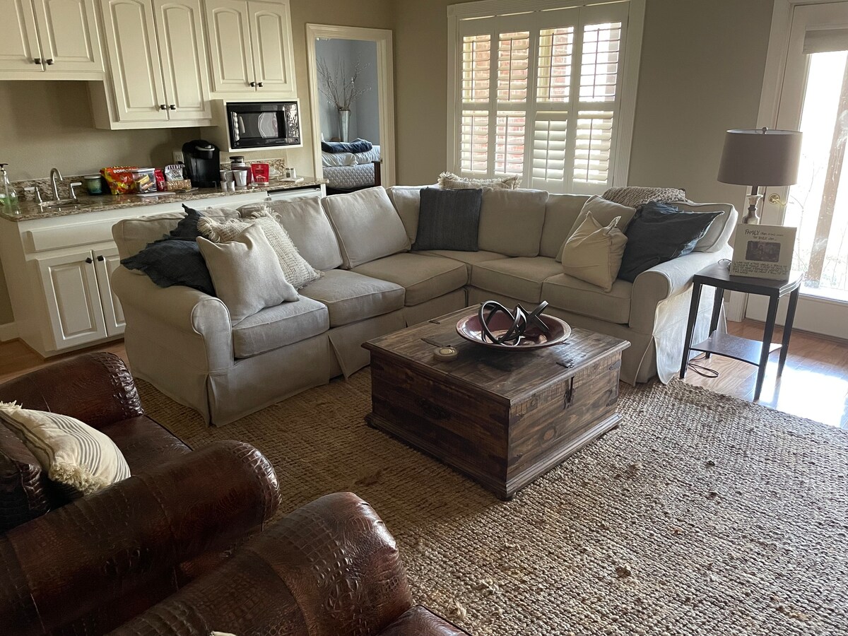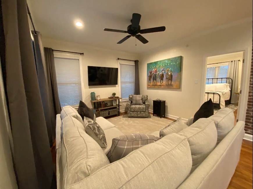 Apt is 1 of 4 in a bldg 100' behind our home on 5 acres in a beautiful valley near the end of a private, tree-lined, dead-end rural road near LRAFB & Pine Valley Golf Course, secluded & quiet yet close to the city. 560sf apt has a 190sf BR with king bed, 50" fs smart TV, ceiling fan, & closet; 80sf full bath/laundry; 280sf LR/full kit w/ service for 6, 65" fs smart TV, ceiling fan, queen sofa bed, love seat rocker/recliner w/ console; all wrapped in foam insulation for max sound barrier.