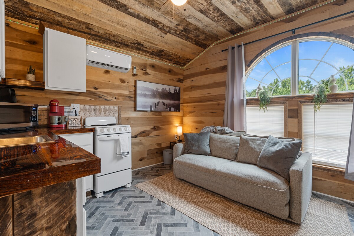 Romantic treetop retreat with tranquil pond views and a glowing fountain, set on five private acres of pure privacy. Indulge in the deep soaking tub, enjoy heated towel rack, or unwind in the hot tub beneath a blanket of stars. Spend your days playing cornhole, ping pong, and paddling across the pond in a paddle boat provided , then step into a full retro arcade tucked inside a classic Airstream camper. Nature, luxury, and endless fun combine for an unforgettable getaway.