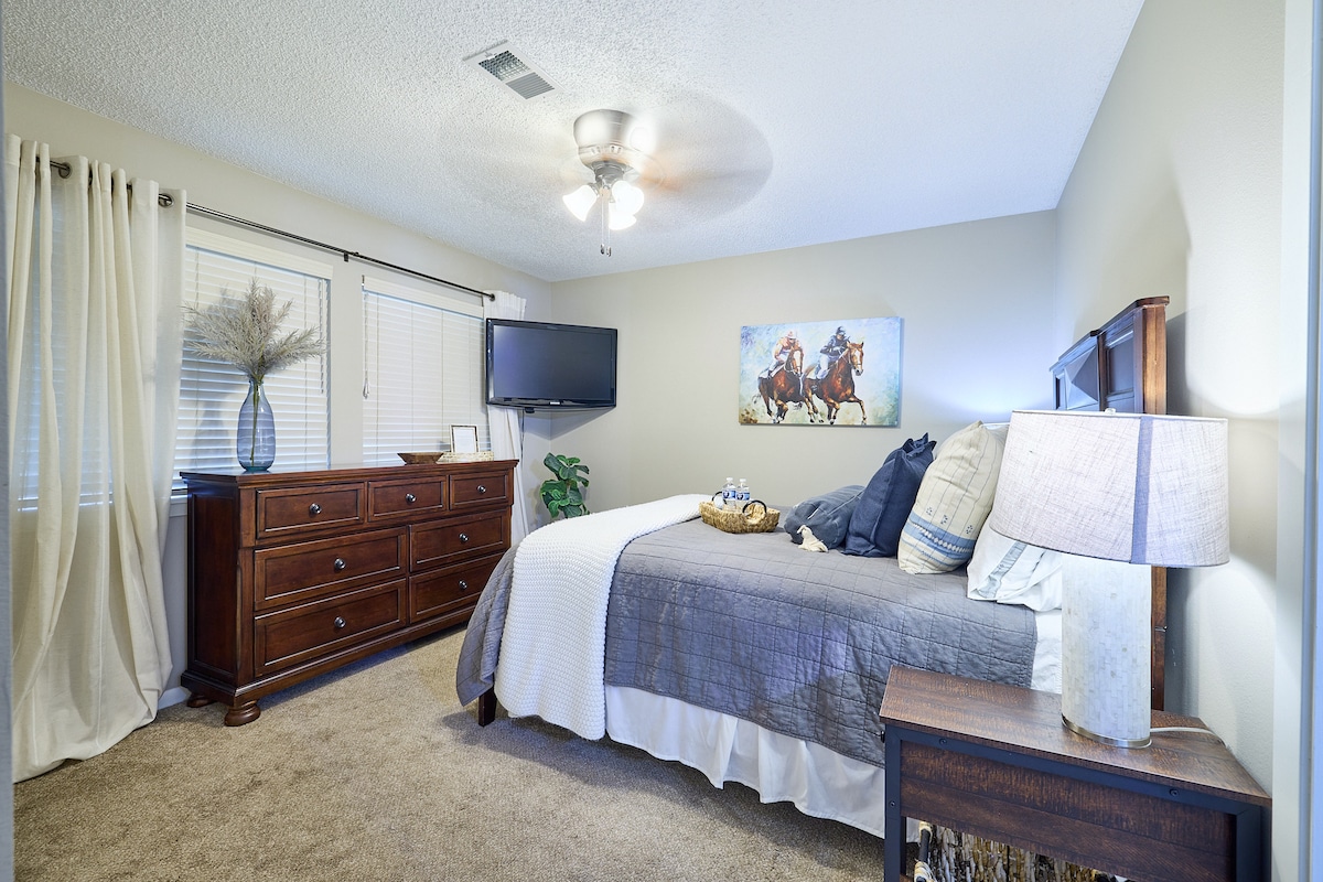 Romantic cabin; perfect, unique country escape. 1440sf open floor-plan w/king sized bed in the main area, 75” tv (WiFi, tv apps; no cable), electric fireplaces, kitchen (no dishwasher), full sized w/d, dining area, walk-in closet, one bath w/shower & tub. Adjoining room separated by curtains & furnishings, not walls/doors. Includes a twin daybed w/pop-up trundle that makes it a king. Sits on 20 fenced acres w/secure gated entry, fire pit & fishing pond that won’t disappoint!