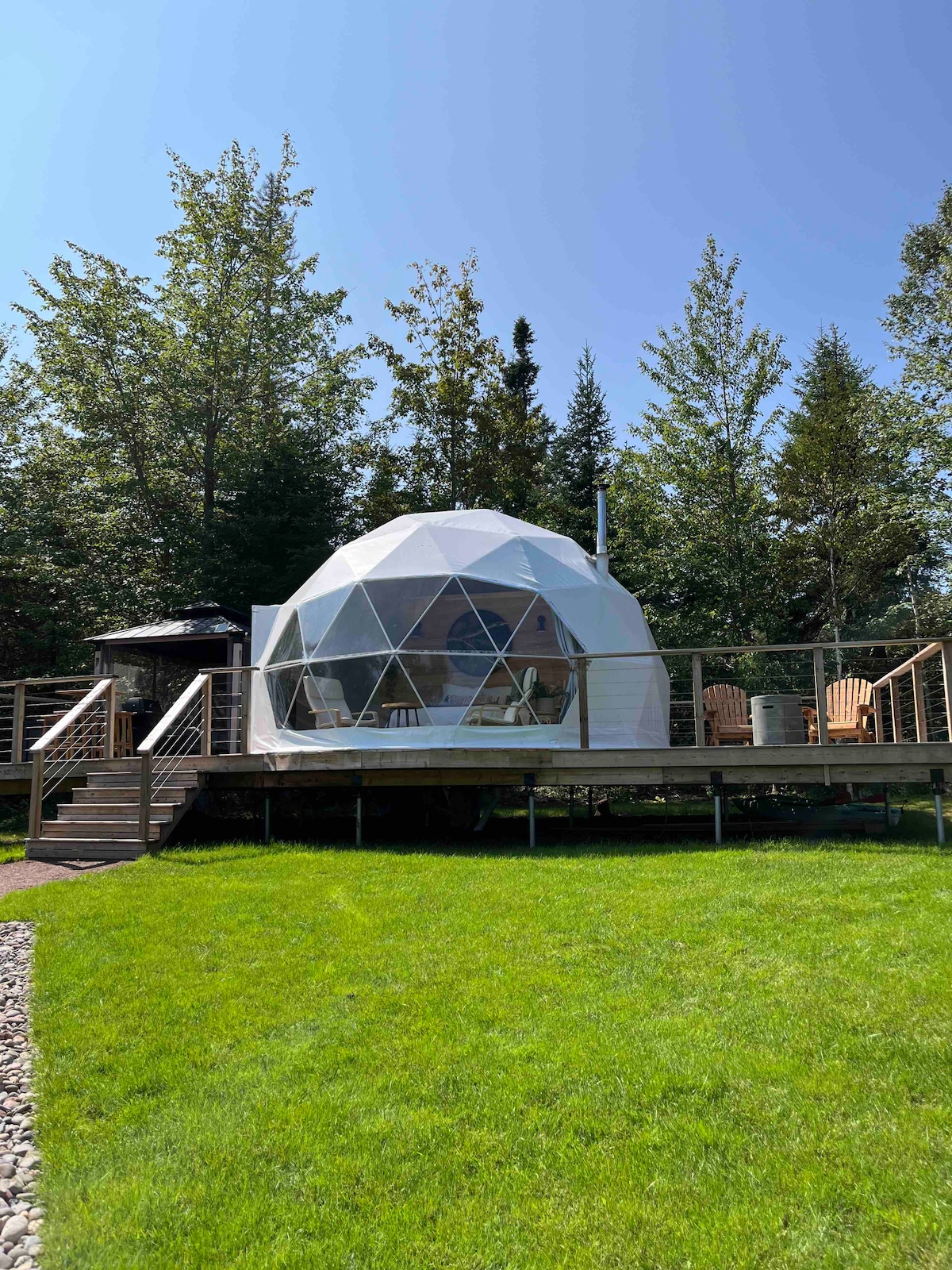 Welcome to Jolicure Cove! Located just 10 minutes from the Aulac Big Stop. Prepare yourself for a total nature immersion in our private lake front dome. You can expect complete peace and quiet except the sounds of the breeze, the loons and other forest animals. The dome is the only one on the property, which sits on over 40 acres! Enjoy yourself playing games on the lawn, sitting around a fire at the fire pit, or reading out on the dock.