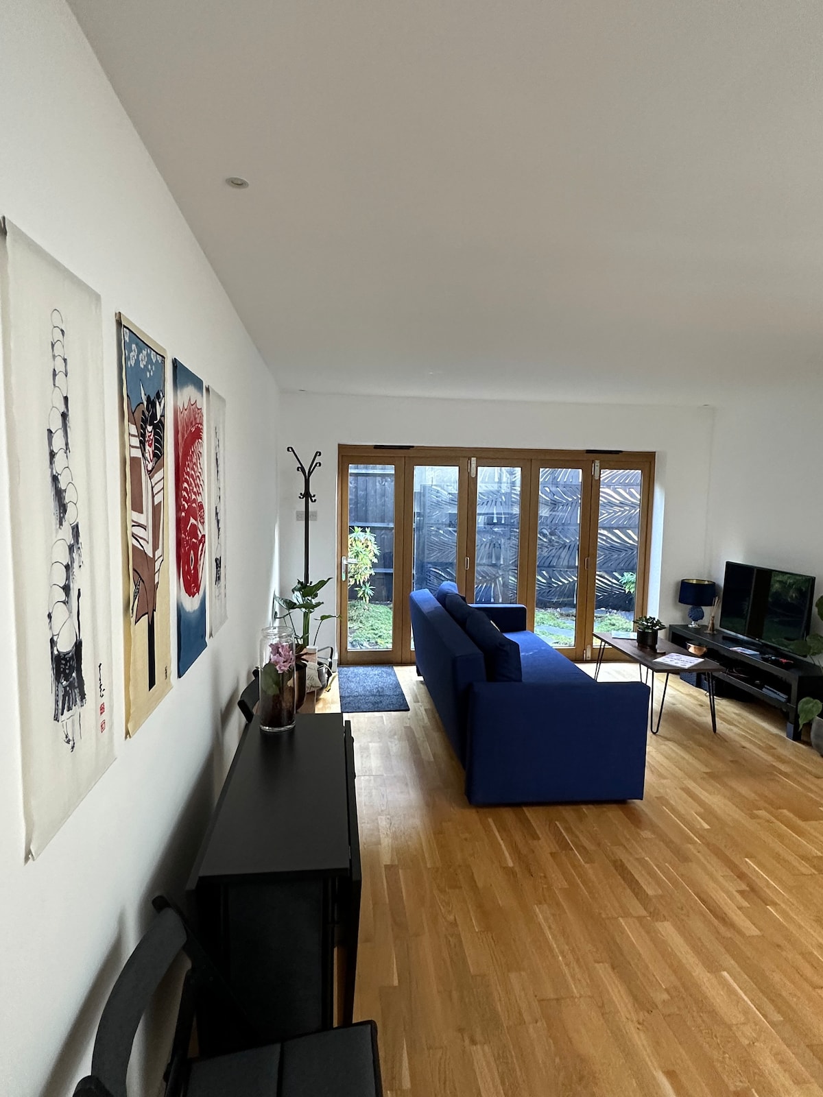 🌊 Flint Cottage is just 3 minutes from the award-winning beach. 🛏 Two bedrooms: the master has a double bed, ensuite shower and desk; the second has a bunk bed with double below, single above, plus a desk. 🌙 Both bedrooms and the lounge have blackout curtains, helping everyone get a restful night’s sleep. 🛋️ The lounge has two sofas (one a sofa bed), a 48″ OLED TV with Google TV, PlayStation and games. 🌸 A private courtyard is filled with plants and features a handmade mosaic table.
