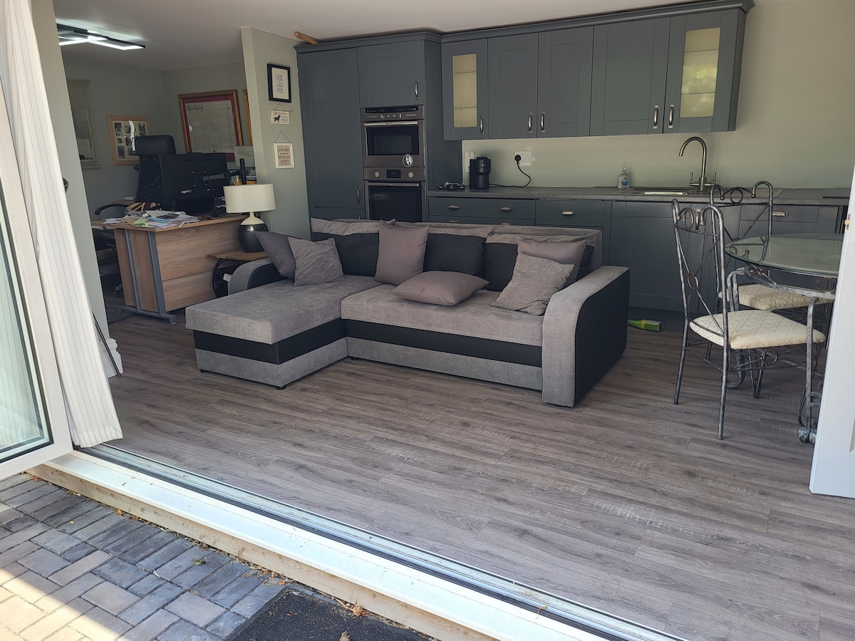 Welcome to our self contained one bedroom annex complete with private kitchen, shower room and living room. The bedroom & living room are freshly decorated. Guests have their own entrance to the annex which is adjoining to the main house but separated by two doors. Feel free to use the garden and bar-be-que and to sit wherever you like. We have a friendly dog who will wonder around but keep away. We don’t charge extra cleaning fees to bump the price up, we just ask that you leave the annex tidy
