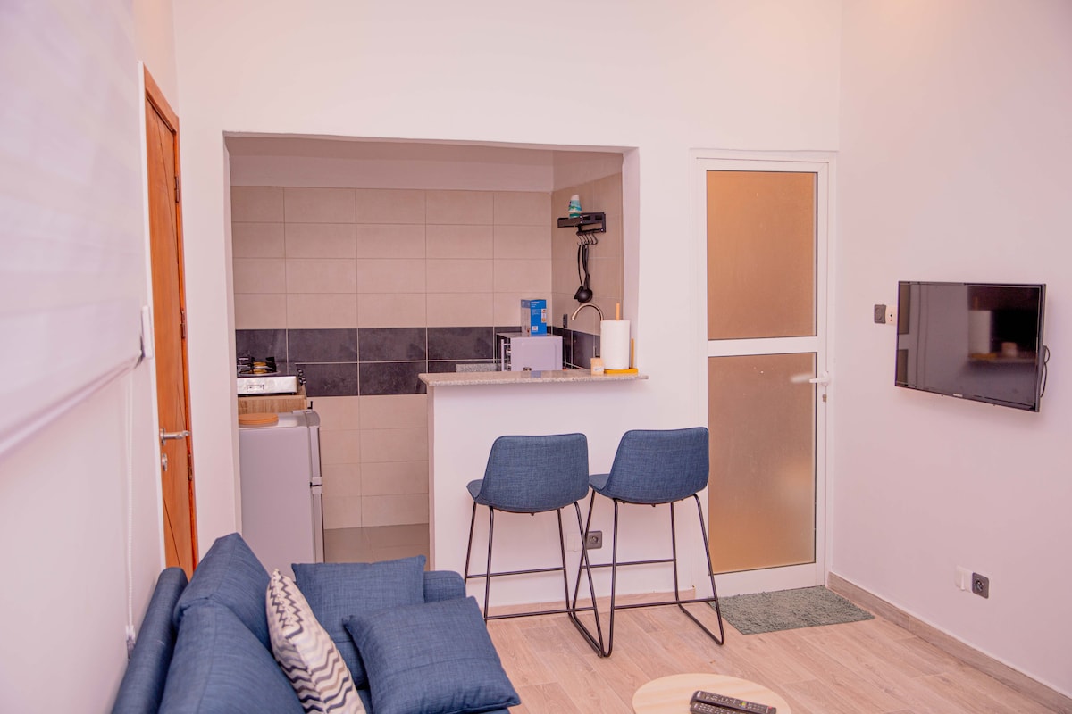 T2 Cosy, Équipé à Agla Figaro, ce charmant T2 climatisé vous offre un séjour confortable avec : * Salon : Canapé 3 places, Smart TV QLED 55", table à manger. * Chambre climatisée : Lit queen size, bureau, armoire, fer/planche à repasser, brasseur d'air Bluetooth/lumières, salle de bains attenante avec chauffe eau intégré. * Cuisine équipée : Lave-linge, four, micro-ondes, frigo, cuisinière (3 feux à gaz + plaque électrique). * Extras : Couloir, vélo fixe, toilette visiteur, petite terrasse.